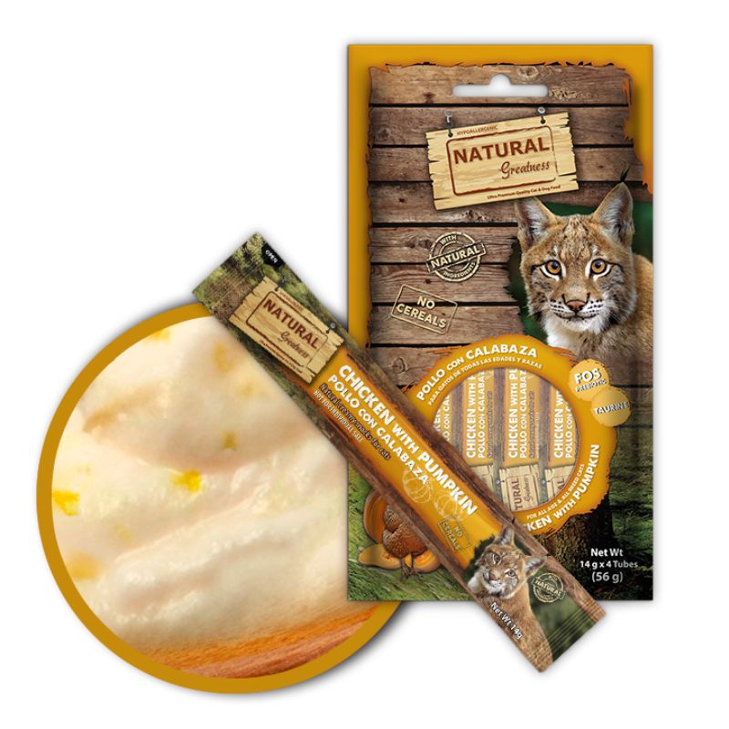 NATURAL GREATNESS POLLO CON CALABAZA es un suave snack cremoso hipoalergénico, elaborado sin cereales a partir de carne de pollo de primera calidad, ingredientes naturales como la calabaza y enriquecido con taurina y fructooligosacáridos, prebióticos muy beneficiosos para mantener una buena salud digestiva.