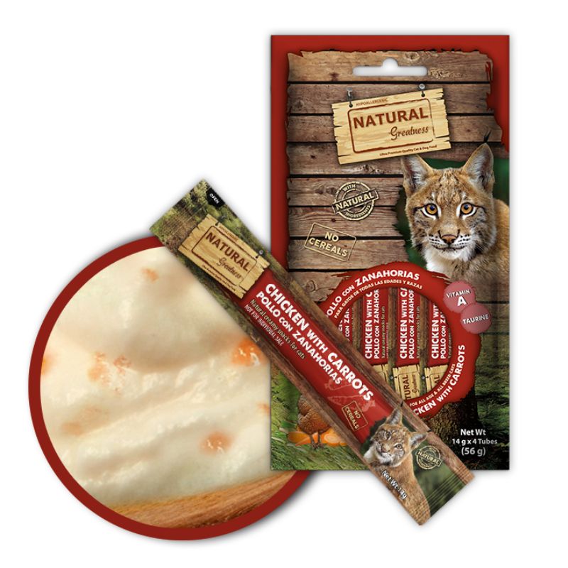 NATURAL GREATNESS POLLO CON ZANAHORIAS es un suave snack cremoso hipoalergénico, elaborado sin cereales a partir de carne de pollo de primera calidad, ingredientes naturales como la zanahoria y enriquecido con taurina y vitamina A como apoyo a la nutrición de los ojos y a la mejora de la visión del gato.