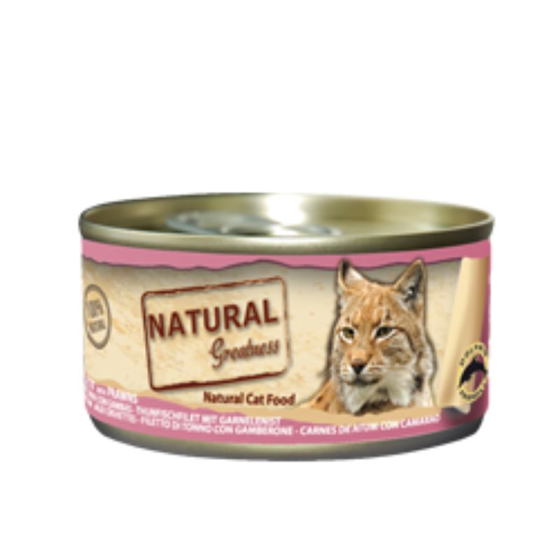 Natural Greatness FILETE DE ATÚN CON GAMBAS es una excelente receta húmeda complementaria, ultra premium e hipoalergénica, desarrollada idealmente como premio o recompensa a gatos adultos. Este alimento natural a base de ricos filetes de atún troceados y gambas de alta calidad contiene únicamente los ingredientes listados, sin aditivos, derivados animales, subproductos o rellenos.