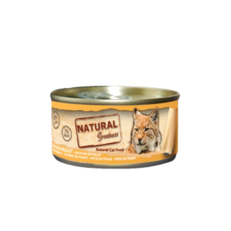 Natural Greatness PECHUGA DE POLLO es una excelente receta húmeda complementaria, ultra premium e hipoalergénica, desarrollada idealmente como premio o recompensa a gatos adultos. Este alimento natural a base de pechuga de pollo troceada de alta calidad contiene únicamente los ingredientes listados, sin aditivos, derivados animales, subproductos o rellenos.