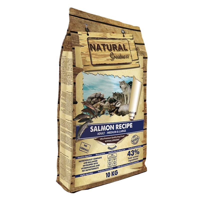 Natural Greatness RECETA DE SALMÓN es una excelente receta ultra premium, hipoalergénica y monoproteica formulada sin cereales diseñada para perros adultos de razas medianas y grandes con problemas en la piel o el pelaje. Esta receta posee una alta concentración de omega 3 y 6 que favorecen el sistema inmunitario y mejoran el tránsito intestinal. Todos los ingredientes de este alimento han sido seleccionados por su baja capacidad alergénica y su alto nivel de calidad, haciendo de ella el alimento ideal para perros con sensibilidad al pollo u otras carnes.