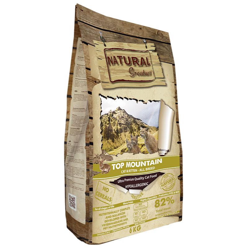 Natural Greatness TOP MOUNTAIN es una excelente receta ultra premium, hipoalergénica y monoproteica formulada sin cereales y desarrollada idealmente para satisfacer las necesidades nutricionales de gatitos, gatas gestantes y gatos. Esta receta incorpora carne de conejo como única fuente de proteína animal, ideal para aquellos gatos con sensibilidad a otras carnes más comunes como el pollo. Además, este alimento favorece el tracto digestivo, mejora el sistema inmunológico del gato y optimiza el nivel de PH en la orina gracias a su contenido en proteína de alta calidad y óptimos niveles de magnesio y ácidos grasos omega 3 y 6. La calidad de los ingredientes naturales empleados en nuestras recetas les aporta altos niveles de palatabilidad y digestibilidad.