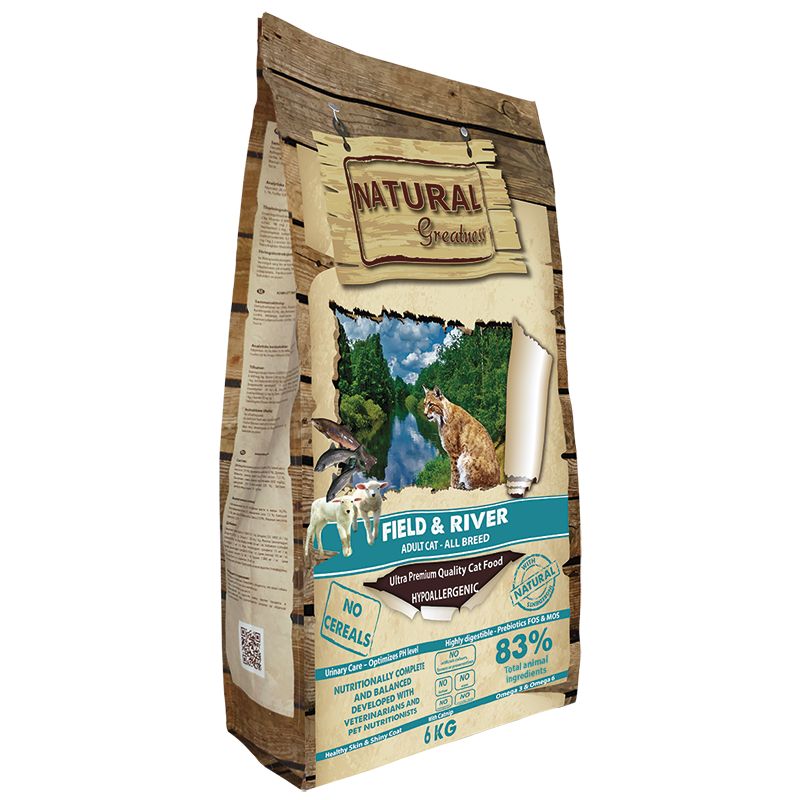 Natural Greatness FIELD & RIVER es una excelente receta ultra premium, hipoalergénica formulada sin cereales y desarrollada idealmente para satisfacer las necesidades nutricionales de gatos adultos. Esta receta incorpora altos porcentajes de carne de cordero y salmón con bajos niveles de carbohidratos, ideal para gatos adultos de todas las razas con sensibilidades a carnes más comunes como el pollo. Sus altos niveles de proteínas de alta calidad favorecen el tránsito intestinal, ayudan a desarrollar y mantener la energía y la masa muscular del gato, así como a optimizar el nivel de pH urinario. La calidad de los ingredientes naturales empleados en nuestras recetas les aporta altos niveles de palatabilidad y digestibilidad.