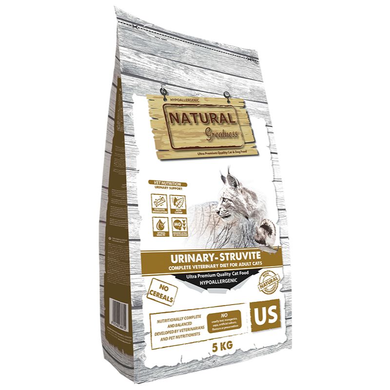 Natural Greatness URINARY - STRUVITE es una receta hipoalergénica completa y sin cereales destinada a gatos adultos con urolitiasis por estruvita y cistitis idiopática felina. Este alimento se caracteriza por su poder de disolución y reducción de la aparición de cálculos de estruvita gracias a sus propiedades de acidificación de la orina y a su bajo contenido en magnesio. Además, también posee un contenido reducido en sodio, potasio y calcio para apoyar el buen funcionamiento del aparato urinario. Además, su fórmula antiestrés con proteína láctea hidrolizada contiene alfa-capsozepina, un ansiolítico natural que causa un efecto positivo en el sistema nervioso y circulatorio del gato.